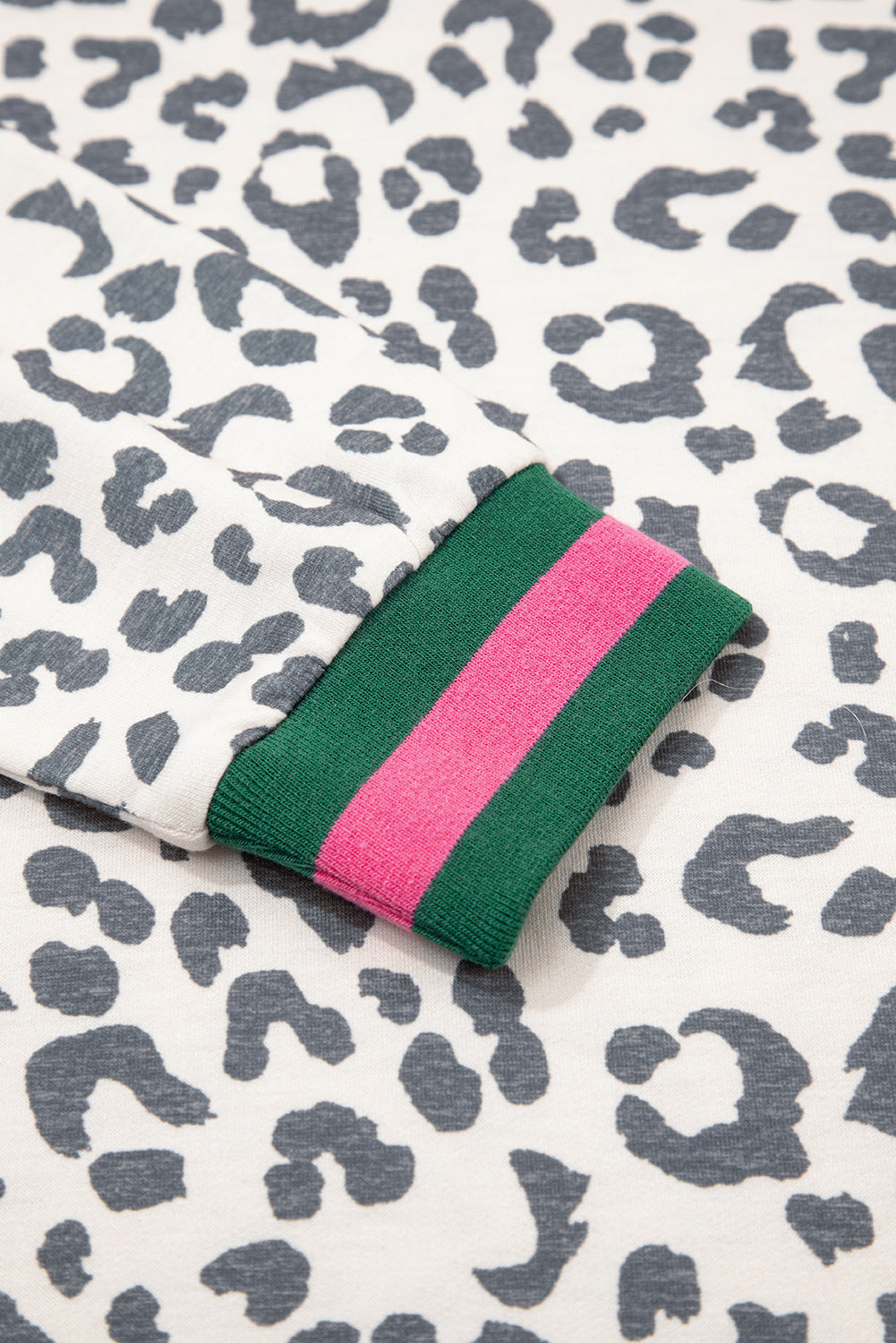 Gray Leopard Contrast Trim Long Sleeve Pullover and Pants Set