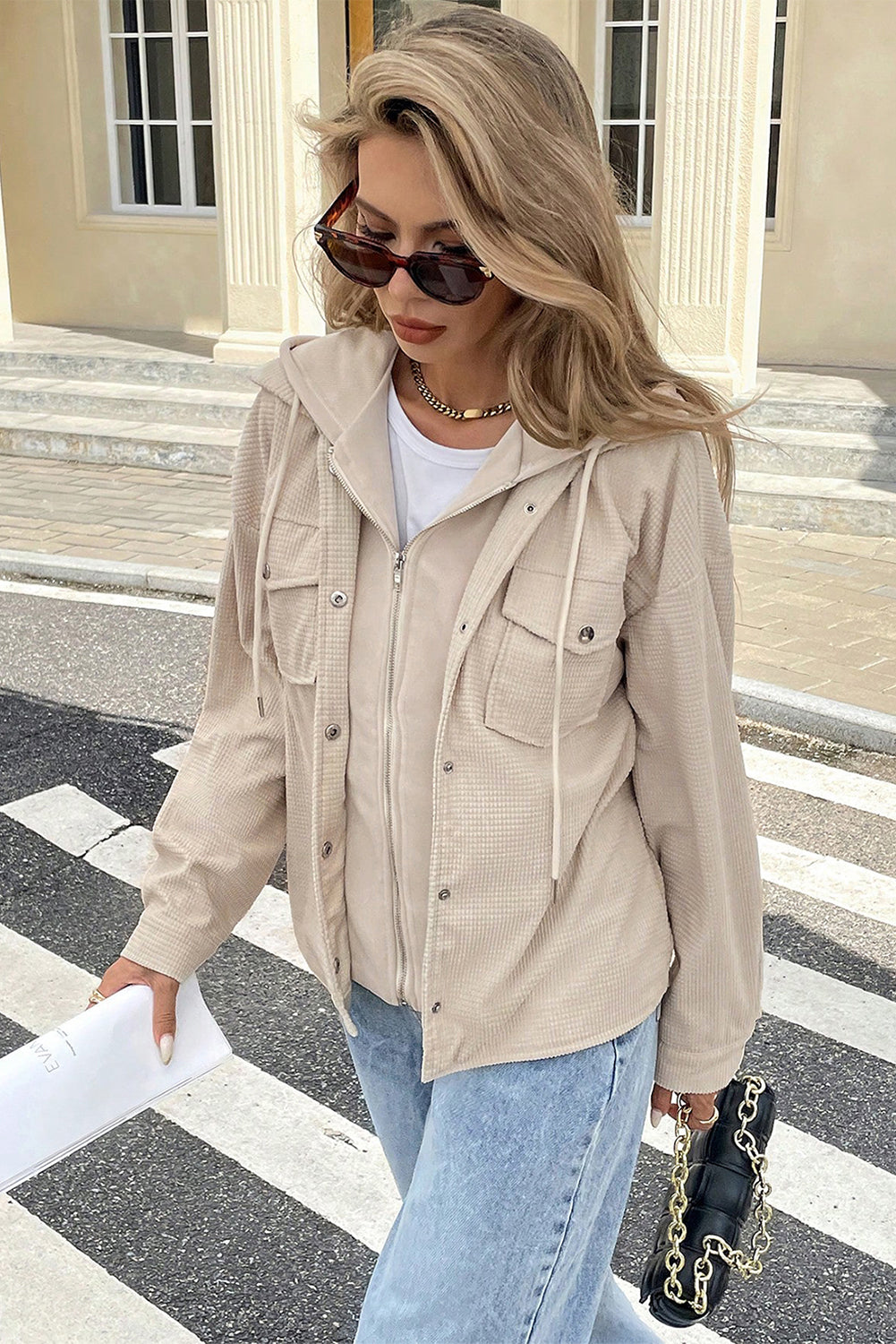 - This shacket features a textured patchwork design for a trendy twist on a classic style.